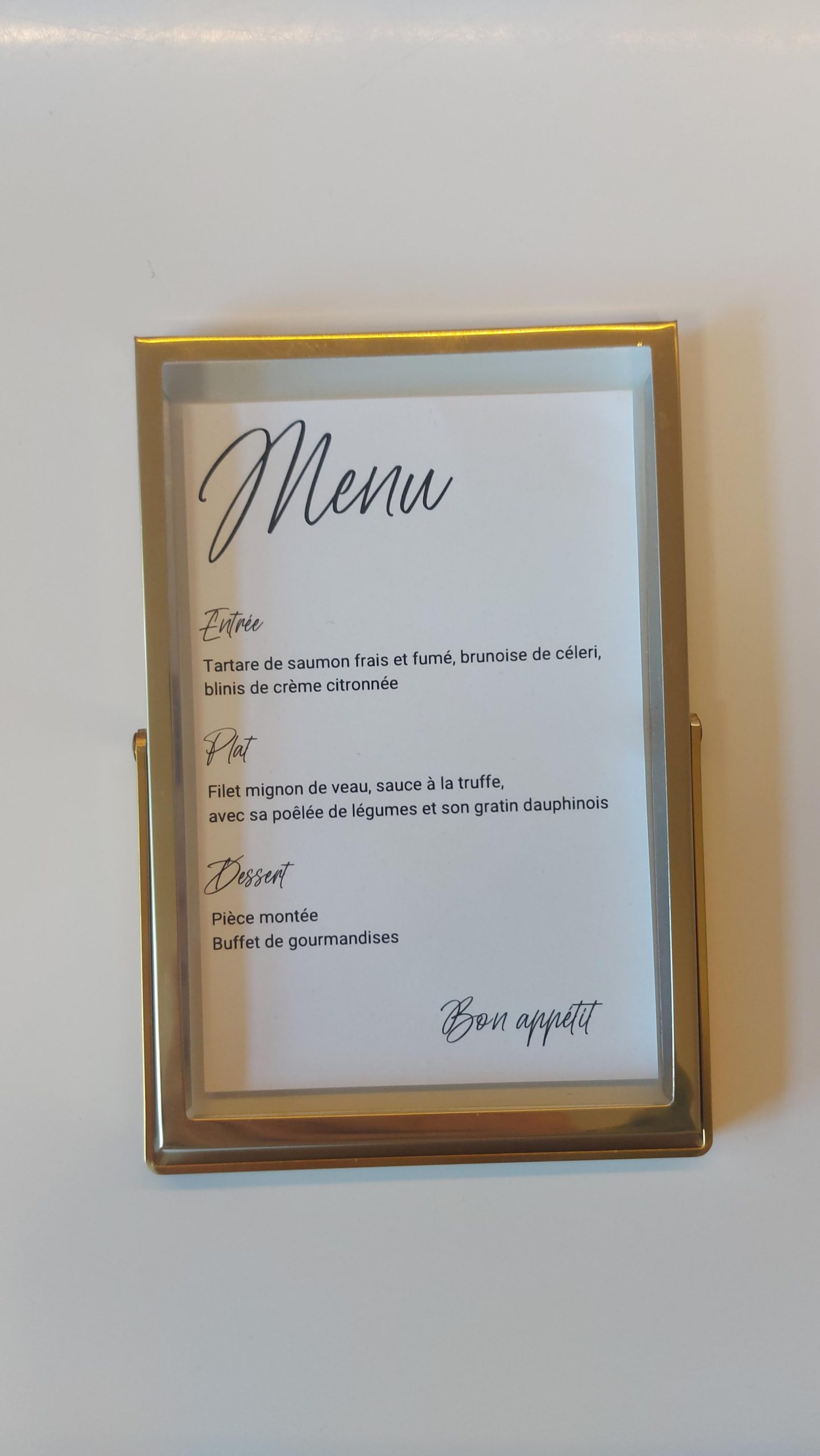Ce format (proche du A5) est la taille idéale pour la signalétique de table qui doit être lue facilement, sans être encombrante. La finition dorée métallisée est très brillante et apporte instantanément une touche de glamour et de luxe à votre décoration. Ce cadre est un excellent choix pour afficher clairement les menus, les numéros de table, ou un QR code pour le programme de l’événement. Son format intermédiaire en fait un support polyvalent pour un décor sophistiqué.